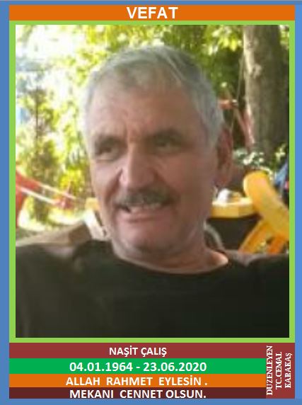 YENİCE KAYAARKASI KÖYÜ NÜFUSUNA KAYITLI OLUP, KARABÜK İLİ SOĞUKSU MAHALLESİ SAKİNLERİNDEN, YENİCE KAYAARKASI KÖYÜ ÖMEROĞLU KÜME EVLERİNDE İKAMET EDEN MERHUM DURSUN ve HANİFE OĞLU, EMEKLİ NAŞİT ÇALIŞ (04.01.1964 DOĞUMLU) HAKKIN RAHMETİNE KAVUŞMUŞTUR. CENAZESİ (23.06.2020 SALI GÜNÜ) YENİCE KAYAARKASI KÖYÜ HOLOMONOĞLU MAHALLESİNDE İKİNDİ NAMAZINDAN SONRA KILINACAK CENAZE NAMAZINA MÜTEAKİP SON YOLCULUĞUNA UĞURLANACAKTIR. ÇOCUKLARI DURSUN ÇALIŞ, MURAT ÇALIŞ, ŞAHİN ÇALIŞ, PINAR ÇALIŞ, BAHAR ÇALIŞ, KARDEŞLERİ BEYHAN ÇALIŞKAN, DÖNDÜ GÖKTAŞ, YADİGAR KIRMIZI. ALLAH RAHMET EYLESİN. MEKANI CENNET OLSUN. GERİDE BIRAKTIĞI SEVENLERİNE VE AİLESİNE BAŞSAĞLIĞI VE SABIR DİLERİZ.