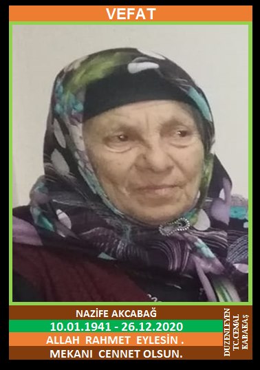 YENİCE YORTAN DERE MAHALLESİ NÜFUSUNA KAYITLI OLUP, YORTAN DERE MAHALLESİ ŞEYHOĞLU KÜME EVLERİ NO: 26/A’DA İKAMET EDEN MERHUM HÜSNÜ ve MERHUME KEZBAN KIZI, KAZIM AKCABAĞ EŞİ, NAZİFE AKCABAĞ (10.01.1941 DOĞUMLU) HAKKIN RAHMETİNE KAVUŞMUŞTUR. CENAZESİ (26.12.2020 CUMARTESİ GÜNÜ) YORTAN DERE MAHALLESİ MERKEZ CAMİİNDE SAAT:15.00’DA KILINACAK CENAZE NAMAZINDAN SONRA SON YOLCULUĞUNA UĞURLANACAKTIR. EŞİ KAZIM AKCABAĞ, ÇOCUKLARI SATILMIŞ AKCABAĞ, SAMİ AKCABAĞ, İHSAN AKCABAĞ, AYŞE GÖYNÜK, AYSEL GÖYNÜK, DAMATLARI MUZAFFER GÖYNÜK, ERGÜN GÖYNÜK. ALLAH RAHMET EYLESİN. MEKANI CENNET OLSUN. GERİDE BIRAKTIĞI SEVENLERİNE VE AİLESİNE BAŞSAĞLIĞI VE SABIR DİLERİZ.