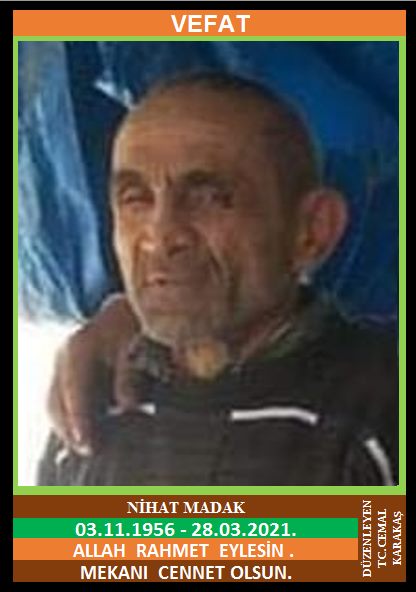 YENİCE TIR KÖYÜ NÜFUSUNA KAYITLI OLUP, TIR KÖYÜ YENİ KÜME EVLERİ NO: 38/A’DA İKAMET EDEN GÜNEY KÖYÜNDE UZUN YILLAR BAKKAL ve KAHVECİLİK YAPAN MERHUM HALİL ve DÖNDÜ OĞLU, KADRİYE MADAK EŞİ, TOST LAKABI İLE BİLİNEN NİHAT MADAK (03.11.1956 DOĞUMLU) HAKKIN RAHMETİNE KAVUŞMUŞTUR. CENAZESİ (28.03.2021 PAZAR GÜNÜ) TIR KÖYÜ CAMİİNDE KILINACAK CENAZE NAMAZINA MÜTEAKİP AİLE MEZARLIĞINA DEFNEDİLEREK SON YOLCULUĞUNA UĞURLANACAKTIR. EŞİ KADRİYE MADAK, ÇOCUKLARI SABRİ MADAK, SERDAR MADAK, SERKAN MADAK, KARDEŞLERİ İRFANİYE MADAK, NAMIK MADAK, İSMET MADAK. ALLAH RAHMET EYLESİN. MEKANI CENNET OLSUN. GERİDE BIRAKTIĞI SEVENLERİNE VE AİLESİNE BAŞSAĞLIĞI VE SABIR DİLERİZ.