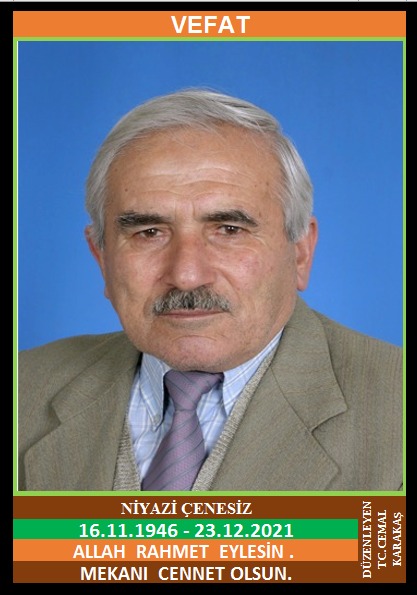 YENİCE GÜNEY KÖYÜ NÜFUSUNA KAYITLI OLUP, YENİCE İSMETPAŞA MAHALLESİ KADILAR KÜME EVLERİ NO:38/1’DE İKAMET EDEN MERHUM KAZIM ve MERHUME SIDIKA OĞLU, SIDIKA ÇENESİZ EŞİ, MADEN EMEKLİSİ NİYAZİ ÇENESİZ (16.11.1946 DOĞUMLU) HAKKIN RAHMETİNE KAVUŞMUŞTUR. CENAZESİ (23.12.2021 PERŞEMBE GÜNÜ) İSMETPAŞA MAHALLE ÇELTİK (ÖTEKÖY) CAMİinDE İKİNDİ NAMAZINA MÜTEAKİP KILINACAK CENAZE NAMAZINDAN SONRA SON YOLCULUĞUNA UĞURLANACAKTIR. EŞİ SIDIKA ÇENESİZ, ÇOCUKLARI EKREM ÇENESİZ, AYNUR ODABAŞ, GÜNGÖR ÇENESİZ, GÜLHAN BEZİRCİ, DAMATLARI YENİCE BELEDİYESİ ESKİ MUHASEBE MÜDÜRÜ SEYFETTİN ODABAŞ, ŞEVKET ÇENESİZ, MUHAMMET BEZİRCİ, KARDEŞLERİ MERHUM HASAN ÇENESİZ, MERHUM OSMAN ÇENESİZ, MERHUM MEHMET ÇENESİZ, KAZIM ÇENESİZ. ALLAH RAHMET EYLESİN. MEKANI CENNET OLSUN. GERİDE BIRAKTIĞI SEVENLERİNE VE AİLESİNE BAŞSAĞLIĞI VE SABIR DİLERİZ.