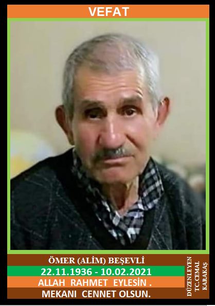 YENİCE ATATÜRK MAHALLESİ NÜFUSUNA KAYITLI OLUP, ATATÜRK MAHALLESİ CEBECİK 1 SOKAK NO:3/1’DE İKAMET EDEN MERHUM SELİM ve MERHUME NAZİFE OĞLU, ÜLVİYE BEŞEVLİ EŞİ ÖMER (ALİM) BEŞEVLİ (22.11.1936 DOĞUMLU) HAKKIN RAHMETİNE KAVUŞMUŞTUR. CENAZESİ (11.02.2021 PERŞEMBE GÜNÜ) ATATÜRK MAHALLESİ MERKEZ CAMİİNDE SAAT: 14.00’DA KILINACAK CENAZE NAMAZINA MÜTEAKİP AİLE MEZARLIĞINA DEFNEDİLEREK SON YOLCULUĞUNA UĞURLANACAKTIR. EŞİ ULVİYE BEŞEVLİ, ÇOCUKLARI MERHUM CEVAT BEŞEVLİ, MERHUM SELİM BEŞEVLİ, HATİCE CEBECİK, NECLA UĞURLAR, DAMATLARI SEBAHATTİN CEBECİK, CENGİZ UĞURLAR, KARDEŞLERİ MERHUM ÖMER BEŞEVLİ, MERHUM M.İLYAS BEŞEVLİ, MERHUME HATİCE CEBECİK. ALLAH RAHMET EYLESİN. MEKANI CENNET OLSUN. GERİDE BIRAKTIĞI SEVENLERİNE VE AİLESİNE BAŞSAĞLIĞI VE SABIR DİLERİZ.