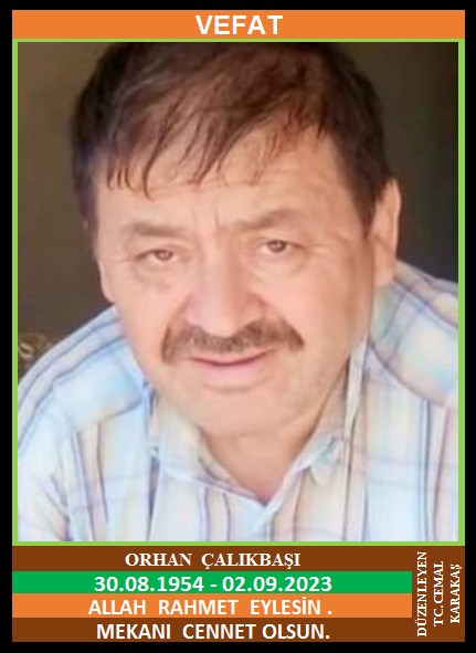 İLÇEMİZ ÖRENKÖY KÖYÜ NÜFUSUNA KAYITLI OLUP, ZONGULDAK İLİ MERKEZ ve ÖRENKÖY KÖYÜ MERKEZ KÜME EVLERİNDE İKAMET EDEN MERHUM DURMUŞ ve MERHUME AZİZE OĞLU, BAHRİYE ÇALIKBAŞI EŞİ, ZONGULDAK ATATÜRK HASTANESİ EMEKLİSİ ORHAN ÇALIKBAŞI (30.08.1954 DOĞUMLU) HAKKIN RAHMETİNE KAVUŞMUŞTUR. CENAZESİ (02.09.2023 CUMARTESİ GÜNÜ) ÖRENKÖY MERKEZ CAMİİNDE ÖĞLE NAMAZINA MÜTEAKİP KILINACAK CENAZE NAMAZINDAN SONRA SON YOLCULUĞUNA UĞURLANACAKTIR. EŞİ BAHRİYE ÇALIKBAŞI, ÇOCUKLARI YÜCEL ÇALIKBAŞ, TUNA ÇALIKBAŞI, NURTEN ÇALIKBAŞI. ALLAH RAHMET EYLESİN. MEKANI CENNET OLSUN. GERİDE BIRAKTIĞI SEVENLERİNE VE AİLESİNE BAŞSAĞLIĞI VE SABIR DİLERİZ.