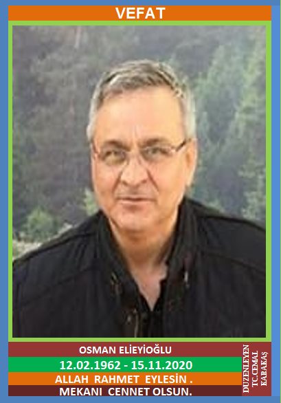 YENİCE GÜNEY KÖYÜ NÜFUSUNA KAYITLI OLUP, YENİCE GÜNEY KÖYÜ KAPANÇUKURU MEVKİ ve KARABÜK ŞİRİNEVLER MAHALLESİ ORUÇ REİS CADDESİ 15/5’DE İKAMET EDEN SELİM ve MERHUME HANİFE OĞLU, MÜRVET ELİEYİOĞLU EŞİ, KARABÜK İLİ EMNİYET MÜDÜRLÜĞÜ EMEKLİSİ OSMAN ELİEYİOĞLU (12.02.1962 DOĞUMLU) HAKKIN RAHMETİNE KAVUŞMUŞTUR. CENAZESİ (15.11.2020 PAZAR GÜNÜ) KILINACAK CENAZE NAMAZINDAN SONRA SON YOLCULUĞUNA UĞURLANACAKTIR. BABASI SELİM ELİEYİOĞLU, EŞİ MÜRVET ELİEYİOĞLU, ÇOCUĞU BURCU İNAM, DAMADI ÖZKAN İNAM, KARDEŞLERİ ORHAN ELİEYİOĞLU, FERİHA ELİEYİOĞLU, ZELİHA ŞIK, AZİZE MEŞEBAŞI, SIDIKA SAZOĞLU, ENİŞTELERİ KAMİL ŞIK, ESKİ YENİCE BELEDİYE MECLİS ÜYESİ ve EMEKLİ ÖĞRETMEN YÜKSEL MEŞEBAŞI, MÜFTÜLÜK İMAM HATİBİ (HOCA) NİZAMETTİN SAZOĞLU. ALLAH RAHMET EYLESİN. MEKANI CENNET OLSUN. GERİDE BIRAKTIĞI SEVENLERİNE VE AİLESİNE BAŞSAĞLIĞI VE SABIR DİLERİZ.