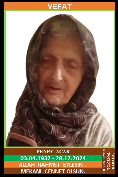 İLÇEMİZ HÜSEYİNBEYOĞLU KÖYÜ ÇAKILLI MAHALLESİ NÜFUSUNA KAYITLI OLUP, HÜSEYİNBEYOĞLU KÖYÜ ÇAKILLI KÜME EVLERİ NO: 16’DA İKAMET EDEN MERHUM HALİL ve MERHUME DUDU KIZI, MERHUM SATILMIŞ ACAR EŞİ, PENPE ACAR (03.04.1932 DOĞUMLU) HAKKIN RAHMETİNE KAVUŞMUŞTUR. CENAZESİ (29.12.2025 PAZARTESİ GÜNÜ) HÜSEYİNBEYOĞLU KÖYÜ MERKEZ CAMİİNDE ÖĞLE NAMAZINA MÜTEAKİP KILINACAK CENAZE NAMAZINDAN SONRA SON YOLCULUĞUNA UĞURLANACAKTIR. EŞİ MERHUM SATILMIŞ ACAR, ÇOCUKLARI HASAN ACAR, DUDU SARI, DÖNDÜ ACAR, AYŞE KÖKCÜ, NACİYE HIRACA, ÜMMİYE ACAR, HATİCE YILMAZ, DAMATLARI ŞENOL KÖKCÜ, MUSTAFA SARI, ZEKİ YILMAZ, İBRAHİM ACAR, NEVZAT HIRACA. ALLAH RAHMET EYLESİN. MEKANI CENNET OLSUN. GERİDE BIRAKTIĞI SEVENLERİNE VE AİLESİNE BAŞSAĞLIĞI VE SABIR DİLERİZ.