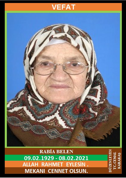 YENİCE IBRICAK KÖYÜ HATİPLER MAHALLESİ NÜFUSUNA KAYITLI OLUP,YENİCE IBRICAK KÖYÜ HATİPLER KÜME EVLERİ NO:1’DE İKAMET EDEN MERHUM HASAN ve MERHUME HATİCE KIZI, MERHUM SATILMIŞ BELEN EŞİ RABİA BELEN (09.02.1929 DOĞUMLU) HAKKIN RAHMETİNE KAVUŞMUŞTUR. CENAZESİ (08.02.2021 PAZARTESİ GÜNÜ) IBRICAK KÖYÜ KUZULUK CAMİİNDE SAAT: 14.00’DA KILINACAK CENAZE NAMAZINA MÜTEAKİP AİLE MEZARLIĞINA DEFNEDİLEREK SON YOLCULUĞUNA UĞURLANACAKTIR. EŞİ MERHUM SATILMIŞ BELEN ,ÇOCUKLARI NAZİKE BELEN, DAMADI MEHMET BELEN, ALLAH RAHMET EYLESİN. MEKANI CENNET OLSUN. GERİDE BIRAKTIĞI SEVENLERİNE VE AİLESİNE BAŞSAĞLIĞI VE SABIR DİLERİZ.