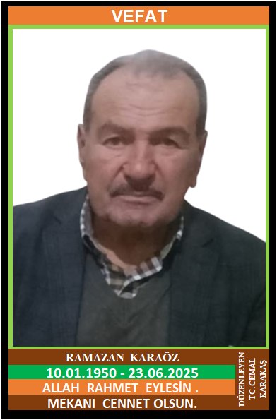 İLÇEMİZ YORTAN BELEDESİ KARAÖMERLER MAHALLESİ NÜFUSUNA KAYITLI OLUP, KARAÖMERLER MAHALLESİ KARAÖZLER KÜME EVLERİ NO:11’DE İKAMET EDEN MERHUM MEHMET ve MERHUME FATİME OĞLU, KEZBAN KARAÖZ EŞİ, KARAÖMERLER MAHALLESİ ESKİ MUHTARI RAMAZAN KARAÖZ (10.01.1950 DOĞUMLU) HAKKIN RAHMETİNE KAVUŞMUŞTUR. CENAZESİ (24.06.2025 SALI GÜNÜ) YORTAN BELDESİ KARAÖMERLER MAHALLESİ MERKEZ CAMİİNDE ÖĞLE NAMAZINA MÜTEAKİP KILINACAK CENAZE NAMAZINDAN SONRA SON YOLCULUĞUNA UĞURLANACAKTIR. EŞİ KEZBAN KARAÖZ, ÇOCUKLARI MEHMET KARAÖZ, YORTAN BELDESİ BELEDİYE MECLİS ÜYESİ EKREM KARAÖZ, FATMA KARAÖZ, DAMADI KARAÖMERLER MAHALLESİ MUHTARI NURETTİN KARAÖZ. ALLAH RAHMET EYLESİN. MEKANI CENNET OLSUN. GERİDE BIRAKTIĞI SEVENLERİNE VE AİLESİNE BAŞSAĞLIĞI VE SABIR DİLERİZ.