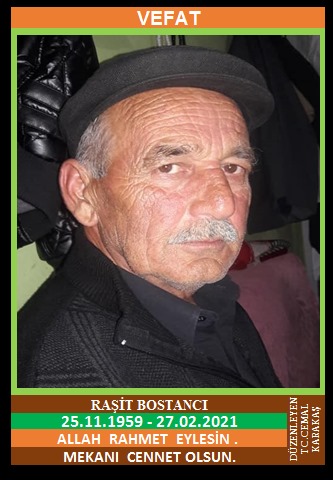 YENİCE ŞİRİNKÖY KÖYÜ NÜFUSUNA KAYITLI OLUP, ŞİRİNKÖY KÖYÜ MERKEZ KÜME EVLERİ NO:77/2’DE İKAMET EDEN MERHUM İSMAİL ve MERHUME AZİME OĞLU, MERHUME BEHİYE BOSTANCI EŞİ, RAŞİT BOSTANCI (25.11.1959 DOĞUMLU) HAKKIN RAHMETİNE KAVUŞMUŞTUR. CENAZESİ (27.02.2021 CUMARTESİ GÜNÜ) ŞİRİNKÖY KÖYÜ MERKEZ CAMİİNDE SAAT: 16.30’DA KILINACAK CENAZE NAMAZINA MÜTEAKİP AİLE MEZARLIĞINA DEFNEDİLEREK SON YOLCULUĞUNA UĞURLANACAKTIR. EŞİ MERHUME BEHİYE BOSTANCI, ÇOCUKLARI İSMAİL BOSTANCI, SADIK BOSTANCI, KARDEŞLERİ YAŞAR BOSTANCI, MERHUM DURMUŞ BOSTANCI, MERHUM KAZIM BOSTANCI, MERHUM VEYİS BOSTANCI, FATMA BOSTANCI. ALLAH RAHMET EYLESİN. MEKANI CENNET OLSUN. GERİDE BIRAKTIĞI SEVENLERİNE VE AİLESİNE BAŞSAĞLIĞI VE SABIR DİLERİZ.