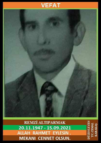 YENİCE SARAY KÖYÜ NÜFUSUNA KAYITLI OLUP, SARAY KÖYÜ KÖLEMEN MEVKİ NO:155/1’DE İKAMET EDEN MERHUM İBRAHİM ve MERHUME SIDIKA OĞLU, MAVİŞ ALTIPARMAK EŞİ, REMZİ ALTIPARMAK (20.11.1947 DOĞUMLU) HAKKIN RAHMETİNE KAVUŞMUŞTUR. CENAZESİ (16.09.2021 PERŞEMBE GÜNÜ) SARAY KÖYÜ KÖLEMEN CAMİİNDE ÖĞLE NAMAZINA MÜTEAKİP KILINACAK CENAZE NAMAZINDAN SONRA SON YOLCULUĞUNA UĞURLANACAKTIR. EŞİ MAVİŞ ALTIPARMAK, ÇOCUKLARI SELAMİ ALTIPARMAK, ÜZEYİR ALTIPARMAK, FEYZİ ALTIPARMAK, MEHMET ALTIPARMAK, MERYEM ALTIPARMAK, RUKİYE ÇELİK. ALLAH RAHMET EYLESİN. MEKANI CENNET OLSUN. GERİDE BIRAKTIĞI SEVENLERİNE VE AİLESİNE BAŞSAĞLIĞI VE SABIR DİLERİZ.