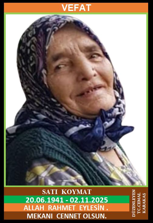 İLÇEMİZ ÇELTİK KÖYÜ NÜFUSUNA KAYITLI OLUP, İSMETPAŞA MAHALLESİ YEŞİL SOKAK NO:7/2’DE İKAMET EDEN MERHUM MUSTAFA ve MERHUME FERZANİYE KIZI, MERHUM HİDAYET KOYMAT EŞİ, SATI KOYMAT (20.06.1941 DOĞUMLU) HAKKIN RAHMETİNE KAVUŞMUŞTUR. CENAZESİ (03.11.2025 PAZARTESİ GÜNÜ) İSMETPAŞA MAHALLESİ MERKEZ CAMİİNDE ÖĞLE NAMAZINA MÜTEAKİP KILINACAK CENAZE NAMAZINDAN SONRA SON YOLCULUĞUNA UĞURLANACAKTIR. EŞİ MERHUM HİDAYET KOYMAT, ÇOCUKLARI ERDAL KOYMAT, FATİME CIBIR, BAHRİYE YİRMİBEŞ, NEŞE ONUR, DAMATLARI YENİCE BELEDİYE MECLİS ÜYESİ HASAN CIBIR, HİLMİ YİRMİBEŞ, ÖZAY ONUR, KARDEŞLERİ ŞEVKET KOCAMAN, NECATİ KOCAMAN, MERHUM İSMAİL KOCAMAN, MERHUM CELAL KOCAMAN. ALLAH RAHMET EYLESİN. MEKANI CENNET OLSUN. GERİDE BIRAKTIĞI SEVENLERİNE VE AİLESİNE BAŞSAĞLIĞI VE SABIR DİLERİZ.