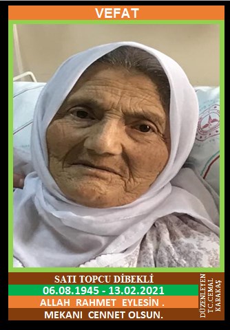 YENİCE ÇAKILLAR KÖYÜ MERKEZ MAHALLESİ NÜFUSUNA KAYITLI OLUP, ÇAKILLAR KÖYÜ MERKEZ MEVKİ NO: 2/A’DA İKAMET EDEN MERHUM MEHMET ve MERHUME FATİME KIZI, ŞİFEK LAKABI İLE BİLİNEN, İSMAİL DİBEKLİ EŞİ SATI TOPCU DİBEKLİ (06.08.1945 DOĞUMLU) HAKKIN RAHMETİNE KAVUŞMUŞTUR. CENAZESİ (13.02.2021 CUMARTESİ GÜNÜ) YENİCE YORTAN MERKEZ CAMİİNDE SAAT: 13.30’DA KILINACAK CENAZE NAMAZINA MÜTEAKİP AİLE MEZARLIĞINA DEFNEDİLEREK SON YOLCULUĞUNA UĞURLANACAKTIR. EŞİ ŞİFEK LAKABI İLE BİLİNEN, İSMAİL DİBEKLİ, ÇOCUKLARI OSMAN DİBEKLİ, ERKAN DİBEKLİ, VEYSEL DİBEKLİ, AYŞE TOPCU, KEZBAN DİBEKLİ, YÜKSEL KAVAKLI, AYNUR DERELİ, AYSEL TİRYAKİ, DAMATLARI MAHİR TOPCU, DURSUN KAVAKLI, HÜSEYİN DİBEKLİ, EKREM DERELİ, NUH TİRYAKİ. ALLAH RAHMET EYLESİN. MEKANI CENNET OLSUN. GERİDE BIRAKTIĞI SEVENLERİNE VE AİLESİNE BAŞSAĞLIĞI VE SABIR DİLERİZ.