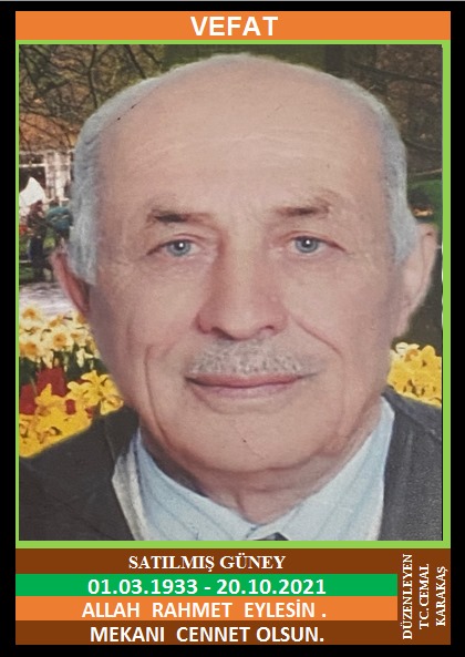 YENİCE SARAY KÖYÜ KÖLEMEN MAHALLESİ NÜFUSUNA KAYITLI OLUP, SARAY KÖYÜ KÖLEMEN MEVKİ NO:149/2’DE İKAMET EDEN MERHUM MUSTAFA ve MERHUME AYİŞE OĞLU, MERHUME KEZBAN GÜNEY EŞİ, ÇAKIR LAKABI İLE BİLİNEN SATILMIŞ GÜNEY (01.03.1933 DOĞUMLU) HAKKIN RAHMETİNE KAVUŞMUŞTUR.CENAZESİ (20.10.2021 ÇARŞAMBA GÜNÜ) SARAY KÖYÜ KÖLEMEN MAHALLESİ CAMİİNDE ÖĞLE NAMAZINA MÜTEAKİP KILINACAK CENAZE NAMAZINDAN SONRA SON YOLCULUĞUNA UĞURLANACAKTIR. EŞİ MERHUME KEZBAN GÜNEY, ÇOCUKLARI SATILMIŞ (MUSTAFA) GÜNEY, AYŞE CİNKAVUK, DURKADIN ALTIPARMAK, MÜRVET SARI, KEZBAN HATIL, DAMATLARI MERHUM MUZAFFER CİNKAVUK, ABDULLAH ALTIPARMAK, İBRAHİM SARI, İSMAİL HATIL. ALLAH RAHMET EYLESİN. MEKANI CENNET OLSUN. GERİDE BIRAKTIĞI SEVENLERİNE VE AİLESİNE BAŞSAĞLIĞI VE SABIR DİLERİZ.