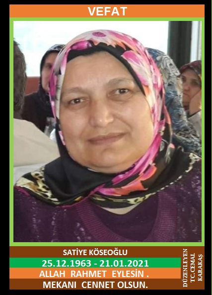 YENİCE HİSAR KÖYÜ NÜFUSUNA KAYITLI OLUP, YENİCE MERKEZ MAHALLESİ İNÖNÜ CADDESİ NO: 27/4’DE İKAMET EDEN MERHUM NİYAZİ ve MERHUME SULTAN KIZI, İSMAİL KÖSEOĞLU EŞİ, SATİYE KÖSEOĞLU (25.12.1963 DOĞUMLU) HAKKIN RAHMETİNE KAVUŞMUŞTUR. CENAZESİ (22.01.2021 CUMA GÜNÜ) HİSAR KÖYÜ KÖYİÇİ İLKOKULU ÖNÜNDE KILINACAK CENAZE NAMAZINDAN SONRA SON YOLCULUĞUNA UĞURLANACAKTIR. EŞİ İSMAİL KÖSEOĞLU, ÇOCUKLARI CUMHUR KÖSEOĞLU, GÜLÇİN ERGÜN, GÜLŞEN BOZKURT, DAMATLARI YASİN ERGÜN, KUBİLAY BOZKURT, KARDEŞLERİ RAMAZAN ÖREN, ORHAN ÖREN, MERHUME FİDAN KARA, DÖNDÜ ÖREN, YETER ÖREN. ALLAH RAHMET EYLESİN. MEKANI CENNET OLSUN. GERİDE BIRAKTIĞI SEVENLERİNE VE AİLESİNE BAŞSAĞLIĞI VE SABIR DİLERİZ.