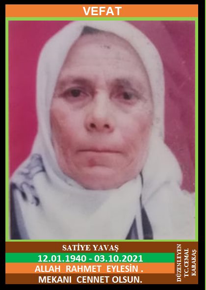 YENİCE YORTAN DÖNGELLER MAHALLESİ NÜFUSUNA KAYITLI OLUP, DÖNGELLER MAHALLESİ DÖNGELLER KÜME EVLERİ NO:7’DE İKAMET EDEN MERHUM HÜSNÜ ve MERHUME KEZBAN KIZI, MERHUM MEHMET YAVAŞ EŞİ, SATİYE YAVAŞ (12.01.1940 DOĞUMLU) HAKKIN RAHMETİNE KAVUŞMUŞTUR. CENAZESİ (04.10.2021 PAZARTESİ GÜNÜ) YENİCE ATATÜRK MAHALLESİ CAMİİNDE KILINACAK CENAZE NAMAZINDAN SONRA SON YOLCULUĞUNA UĞURLANACAKTIR. EŞİ MERHUM MEHMET YAVAŞ, ÇOCUKLARI MERHUM İSMAİL YAVAŞ, ZEKERİYA YAVAŞ, FATMA AKDÖNGEL, MERHUME GÜLİSTAN GÖYNÜK, KEZBAN ÇENGEL, KARDEŞLERİ YUNUS SARIVAZ, MERHUME NAZİFE AKÇABAĞ, TORUNLARI ERDAL YAVAŞ, MEHMET BASRİ YAVAŞ. ALLAH RAHMET EYLESİN. MEKANI CENNET OLSUN. GERİDE BIRAKTIĞI SEVENLERİNE VE AİLESİNE BAŞSAĞLIĞI VE SABIR DİLERİZ.