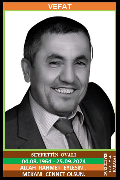 İLÇEMİZ GÖKBEL KÖYÜ HACI ÖMERLER MAHALLESİ NÜFUSUNA KAYITLI OLUP, GÖKBEL KÖYÜ HACI ÖMERLER KÜME EVLERİ NO:17’DE İKAMET EDEN MERHUM REFİK ve AZİZE OĞLU, SATI OVALI EŞİ, SEYFETTİN OVALI (04.08.1964 DOĞUMLU) HAKKIN RAHMETİNE KAVUŞMUŞTUR. CENAZESİ (25.09.2024 ÇARŞAMBA GÜNÜ) GÖKBEL KÖYÜ MERKEZ CAMİİNDE ÖĞLE NAMAZINA MÜTEAKİP KILINACAK CENAZE NAMAZINDAN SONRA SON YOLCULUĞUNA UĞURLANACAKTIR. ANNESİ AZİZE OVALI, EŞİ SATI OVALI, ÇOCUKLARI ORHAN OVALI, GÖKHAN OVALI. ALLAH RAHMET EYLESİN. MEKANI CENNET OLSUN. GERİDE BIRAKTIĞI SEVENLERİNE VE AİLESİNE BAŞSAĞLIĞI VE SABIR DİLERİZ.