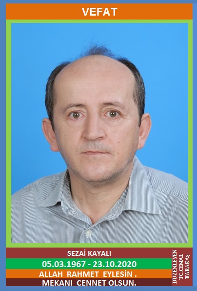 YENİCE BAĞBAŞI KÖYÜ NÜFUSUNA KAYITLI OLUP, YENİCE ÖZAL MAHALLESİ BAĞBAŞI SOKAK NO:6/1’DE İKAMET EDEN RECEP ve MUTİA OĞLU, NERİMAN KAYALI EŞİ, ÖZAL MAHALLESİ KAHVECİ ESNAFI MARAZ LAKABI İLE BİLİNEN SEZAİ KAYALI (05.03.1967 DOĞUMLU) HAKKIN RAHMETİNE KAVUŞMUŞTUR. CENAZESİ (23.10.2020 CUMA GÜNÜ) YENİCE ÖZAL MAHALLESİ MERKEZ CAMİDE KILINACAK CENAZE NAMAZINDAN SONRA SON YOLCULUĞUNA UĞURLANACAKTIR. EŞİ NERİMAN KAYALI, ÇOCUKLARI ÖZGÜR KAYALI, ÖZGE BAĞBAŞI, DAMADI ADNAN BAĞBAŞI. ALLAH RAHMET EYLESİN. MEKANI CENNET OLSUN. GERİDE BIRAKTIĞI SEVENLERİNE VE AİLESİNE BAŞSAĞLIĞI VE SABIR DİLERİZ.