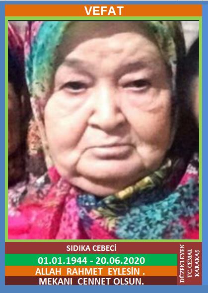 YENİCE ÇAMLIKÖY NÜFUSUNA KAYITLI OLUP, ÇAMLI KÖY AŞAĞI KÜME EVLERİ NO:1’DE İKAMET EDEN MERHUM TAHSİN ve AZİZE KIZI, MERHUM ŞEVKİ CEBECİ EŞİ, ÇAMLIKÖY MUHTARI HİDAYET YİRMİBEŞ’İN KAYINVALDESİ, SIDIKA CEBECİ (01.01.1944 DOĞUMLU) HAKKIN RAHMETİNE KAVUŞMUŞTUR. CENAZESİ (20.06.2020 CUMARTESİ GÜNÜ) YENİCE ÇAMLIKÖY MERKEZ CAMİİNDE İKİNDİ NAMAZINDAN SONRA KILINACAK CENAZE NAMAZINA MÜTEAKİP SON YOLCULUĞUNA UĞURLANACAKTIR. EŞİ MERHUM ŞEVKİ CEBECİ, ÇOCUKLARI SAFİYE YİRMİBEŞ, DURDU YİRMİBEŞ, DAMADI ÇAMLIKÖY MUHTARI HİDAYET YİRMİBEŞ. ALLAH RAHMET EYLESİN. MEKANI CENNET OLSUN. GERİDE BIRAKTIĞI SEVENLERİNE VE AİLESİNE BAŞSAĞLIĞI VE SABIR DİLERİZ.