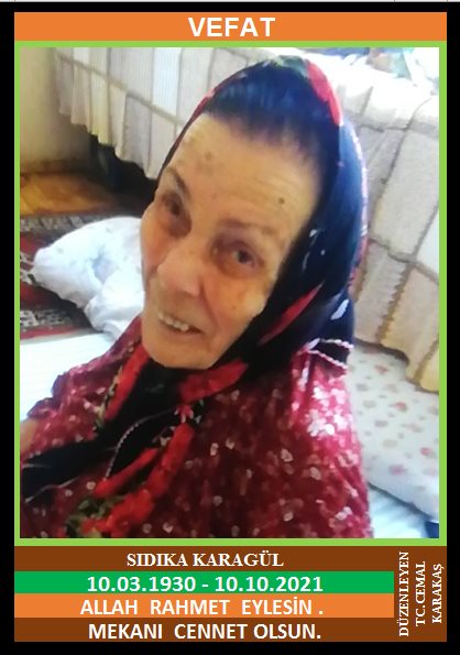 YENİCE MERKEZ MAHALLE NÜFUSUNA KAYITLI OLUP, MERKEZ MAHALLESİ İNÖNÜ CADDESİ NO:46/2’DE İKAMET EDEN MERHUM AHMET ve MERHUME KEZBAN KIZI, MERHUM YENİCE ORMAN İŞLETMESİ MEMUR EMEKLİSİ TEVFİK KARAGÜL’ÜN EŞİ, SIDIKA KARAGÜL (10.03.1930 DOĞUMLU) HAKKIN RAHMETİNE KAVUŞMUŞTUR. CENAZESİ (10.10.2021 PAZAR GÜNÜ) YENİCE MERKEZ CAMİİNDE İKİNDİ NAMAZINA MÜTEAKİP KILINACAK CENAZE NAMAZINDAN SONRA SON YOLCULUĞUNA UĞURLANACAKTIR. EŞİ MERHUM TEVFİK KARAGÜL, ÇOCUKLARI ŞEFİK KARAGÜL, REFİK KARAGÜL, KENAN KARAGÜL, SEVİM ÇAVUŞ, SEVİL ESEN, DAATLARI NİZAMETTİN ÇAVUŞ, VELİ ESEN. ALLAH RAHMET EYLESİN. MEKANI CENNET OLSUN. GERİDE BIRAKTIĞI SEVENLERİNE VE AİLESİNE BAŞSAĞLIĞI VE SABIR DİLERİZ.