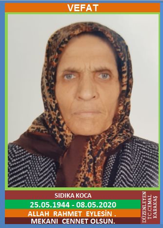 YENİCE BAĞBAŞI KÖYÜ NÜFUSUNA KAYITLI OLUP, MERKEZ MAHALLESİ CELAL BAYAR CADDESİ NO: 84/7 ‘DE İKAMET EDEN EYÜP ve KEZBAN KIZI, MERHUM YUSUF KOCA EŞİ, (25.05.1944 DOĞUMLU) HAKKIN RAHMETİNE KAVUŞMUŞTUR. CENAZESİ (09.05.2020 CUMARTESİ GÜNÜ) ÖZAL MAHALLESİ CAMİİNDE ÖĞLE NAMAZINDAN SONRA SAAT :14.:00’DA KILINACAK CENAZE NAMAZINA MÜTEAKİP SON YOLCULUĞUNA UĞURLANACAKTIR. EŞİ MERHUM YUSUF KOCA, ÇOCUKLARI SEDAT KOCA, AYNUR KOCA, AZİZE KARADAYl, GÜLER BAĞBAŞI. DAMATLARI KEMAL KARADAYI, VEDAT KOCA, KARDEŞLERİ MERHUM ALİRlZA ELİEYİOĞLU, MERHUM NAZİF ELİEYİOĞLU, MERHUM FATİME KOYMATCIK, MUHARREM ELİEYİOĞLU, SELİM ELİEYİOĞLU,MERHUM AHMET ELİEYİOĞLU, MERHUM MEHMET ELİEYİOĞLU, YEĞENLERİ RIFAT KOCA ve MEVLÜT KOCA. ALLAH RAHMET EYLESİN. MEKANI CENNET OLSUN. GERİDE BIRAKTIĞI SEVENLERİNE VE AİLESİNE BAŞSAĞLIĞI VE SABIR DİLERİZ.