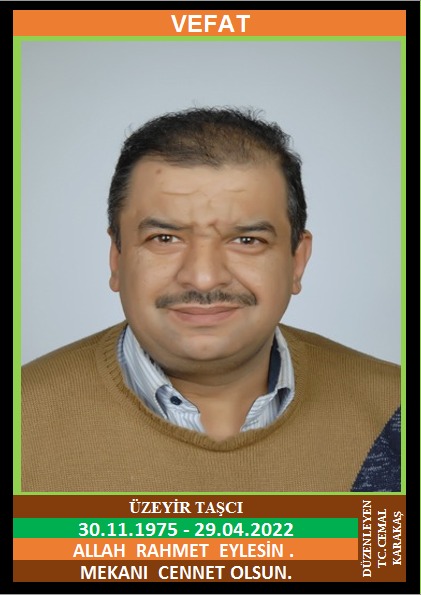 YENİCE DÖNGELLER MAHALLESİ NÜFUSUNA KAYITLI OLUP, YENİCE YORTAN PAZARI MERKEZ MAHALLESİ İNCİLER SOKAK NO :1/1’DE İKAMET EDEN YENİCE ESNAFLARINDAN ŞEVKET TAŞCI ve HATİCE OĞLU, EMİNE TAŞCI EŞİ, SADDAM LAKABI İLE BİLİNEN YENİCE ESNAFLARINDAN ÜZEYİR TAŞCI (30.11.1975 DOĞUMLU) HAKKIN RAHMETİNE KAVUŞMUŞTUR. CENAZESİ (29.04.2022 CUMA GÜNÜ) YORTAN MERKEZ CAMİİNDE CUMA NAMAZINA MÜTEAKİP KILINACAK CENAZE NAMAZINDAN SONRA SON YOLCULUĞUNA UĞURLANACAKTIR. BABASI ŞEVKET TAŞCI, ANNESİ HATİCE TAŞCI, EŞİ EMİNE TAŞCI, ÇOCUKLARI TAYYİP ETHEM TAŞCI, TAHA ENSAR TAŞCI, HAFİZE ERFA TAŞCI, KARDEŞLERİ YUSUF TAŞCI, ŞEVKİ TAŞCI, NURAY TAŞCI, ASİYE TAŞCI. ALLAH RAHMET EYLESİN. MEKANI CENNET OLSUN. GERİDE BIRAKTIĞI SEVENLERİNE VE AİLESİNE BAŞSAĞLIĞI VE SABIR DİLERİZ.
