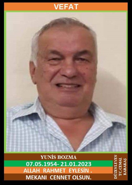 YENİCE KEYFALLAR KÖYÜ NÜFUSUNA KAYITLI OLUP, KEYFALLAR KÖYÜ MERKEZ KÜME EVLERİ NO:18’DE İKAMET EDEN MERHUM MEHMET ve MERHUME KEZBAN OĞLU, NACİYE BOZMA EŞİ, YUNİS BOZMA (07.05.1954 DOĞUMLU) HAKKIN RAHMETİNE KAVUŞMUŞTUR. CENAZESİ (21.01.2023 CUMARTESİ GÜNÜ) KEYFALLAR KÖYÜ MERKEz CAMİİNDE ÖĞLE NAMAZINA MÜTEAKİP KILINACAK CENAZE NAMAZINDAN SONRA SON YOLCULUĞUNA UĞURLANACAKTIR. EŞİ NACİYE BOZMA, ÇOCUKLARI ERDOĞAN BOZMA, ERTAN BOZMA, FATMA TAVUKCU, AYTEN AKBAŞ, AYŞE SOYLU, MİNE DEĞİRMENCİ, DAMATLARI OSMAN TAVUKCU, MUSTAFA AKBAŞ, ZEKERİYA SOYLU, İSMAİL DEĞİRMENCİ. ALLAH RAHMET EYLESİN. MEKANI CENNET OLSUN. GERİDE BIRAKTIĞI SEVENLERİNE VE AİLESİNE BAŞSAĞLIĞI VE SABIR DİLERİZ.