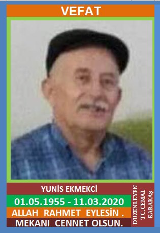 YENİCE SARAY KÖYÜ NÜFUSUNA KAYITLI OLUP, SARAY KÖYÜ KÖLEMEN MEVKİ NO:124/1’DE İKAMET EDEN MERHUM RIFAT ve KEZBAN OĞLU, FATİME EKMEKCİ EŞİ, YUNİS EKMEKCİ (01.05.1955 DOĞUMLU) HAKKIN RAHMETİNE KAVUŞMUŞTUR. CENAZESİ (12.03.2020 PERŞEMBE GÜNÜ) SARAY KÖYÜ MERKEZ CAMİİNDE ÖĞLE NAMAZINA MÜTEAKİP KILINACAK CENAZE NAMAZINDAN SONRA SON YOLCULUĞUNA UĞURLANACAKTIR. EŞİ FATİME EKMEKCİ, ÇOCUKLARI SEBAHATTİN EKMEKCİ, SERDAR EKMEKCİ, SEDAT EKMEKCİ, KEZBAN DERELİ. ALLAH RAHMET EYLESİN. MEKANI CENNET OLSUN. GERİDE BIRAKTIĞI SEVENLERİNE VE AİLESİNE BAŞSAĞLIĞI VE SABIR DİLERİZ.