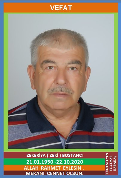 YENİCE ŞİRİNKÖY KÖYÜ NÜFUSUNA KAYITLI OLUP, ŞİRİNKÖY MERKEZ MEVKİ NO:90/1’DE İKAMET EDEN MERHUM OSMAN ve HATİCE OĞLU, FATMA BOSTANCI EŞİ, BATAKCININ ZEKİ LAKABI İLE BİLİNEN MADEN EMEKLİSİ ZEKERİYA BOSTANCI (21.01.1950 DOĞUMLU) HAKKIN RAHMETİNE KAVUŞMUŞTUR. CENAZESİ (23.10.2020 CUMA GÜNÜ) ŞİRİNKÖY MERKEZ CAMİİNDE KILINACAK CENAZE NAMAZINDAN SONRA SON YOLCULUĞUNA UĞURLANACAKTIR. EŞİ FATMA BOSTANCI, ÇOCUKLARI YÜKSEL BOSTANCI, SATILMIŞ BOSTANCI, ZEKİ BOSTANCI, SEZGİN BOSTANCI, AYHAN BOSTANCI, SEVİM KAYA, DAMADI MERHUM NİHAT KAYA. ALLAH RAHMET EYLESİN. MEKANI CENNET OLSUN. GERİDE BIRAKTIĞI SEVENLERİNE VE AİLESİNE BAŞSAĞLIĞI VE SABIR DİLERİZ.