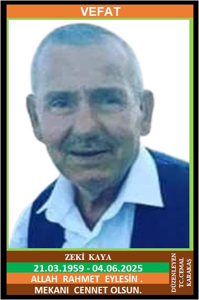 İLÇEMİZ DEĞİRMENYANI KÖYÜ NÜFUSUNA KAYITLI OLUP, KOCAELİ İLİ GÖLCÜK İLÇESİ ve YENİCE DEĞİRMENYANI KÖYÜ MERKEZ KÜME EVLERİ’NDE İKAMET EDEN MERHUM AHMET ve MERHUME FATİME OĞLU, GÜLER KAYA EŞİ, ZEKİ KAYA (21.03.1959 DOĞUMLU) HAKKIN RAHMETİNE KAVUŞMUŞTUR. CENAZESİ (04.06.2025 ÇARŞAMBA GÜNÜ) ŞİRİNKÖY KÖYÜ MERKEZ CAMİİNDE İKİNDİ NAMAZINA MÜTEAKİP KILINACAK CENAZE NAMAZINDAN SONRA SON YOLCULUĞUNA UĞURLANACAKTIR. EŞİ GÜLER KAYA, ÇOCUKLARI VOLKAN KAYA, ADEM KAYA, MELEK KAYA, KARDEŞLERİ DURSUN KAYA, MERHUM YAŞAR KAYA. ALLAH RAHMET EYLESİN. MEKANI CENNET OLSUN. GERİDE BIRAKTIĞI SEVENLERİNE VE AİLESİNE BAŞSAĞLIĞI VE SABIR DİLERİZ.