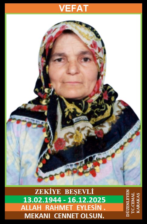 İLÇEMİZ ATATÜRK MAHALLESİ NUFUSUNA KAYITLI OLUP, ATATÜRK MAHALLESİ ÇENGELLER KÜME EVLERİ NO:13/1’DE İKAMAT EDEN MERHUM İSMAİL ve MERHUME AZİZE KIZI, TACİR LAKABI İLE BİLİNEN MEHMET BEŞEVLİ EŞİ, GAZETEMİZ EMEKTARLARINDAN ŞABAN BEŞEVLİ’NİN ANNESİ ZEKİYE BEŞEVLİ (13.02.1944 DOĞUMLU ) HAKKIN RAHMETİNE KAVUŞMUŞTUR. CENAZESİ (16.12.2025 SALI ÜNÜ) ATATÜRK MAHALLESİ MEVLANA CAMİİNDE ÖĞLE NAMAZINA MÜTEAKİP KILINACAK CENAZE NAMAZINDAN SONRA SON YOLCULUĞUNA UĞURLANACAKTIR. EŞİ MEHMET BEŞEVLİ, ÇOCUKLARI DURSUN BEŞEVLİ, ŞABAN BEŞEVLİ, NAİLE İNAM, DAMADI BİROL İNAM, TORUNLARI ORÇUN BEŞEVLİ, ONUR BEŞEVLİ, M. ENGİN BEŞEVLİ, EMİRHAN İNAM. ALLAH RAHMET EYLESİN. MEKANI CENNET OLSUN. GERİDE BIRAKTIĞI SEVENLERİNE VE AİLESİNE BAŞSAĞLIĞI VE SABIR DİLERİZ.