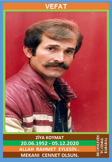 YENİCE ÇELTİK KÖYÜ KURUOSMANLAR MAHALLESİ NÜFUSUNA KAYITLI OLUP, YENİCE MENDERES MAHALLESİ AŞAĞIKÖY ALTINKENT SİTESİ NO:3’DE İKAMET EDEN MERHUM KADİR ve MERHUME HATİCE OĞLU, MERHUME ZELİHA KOYMAT EŞİ, YENİCE ORMAN İŞLETMESİ EMEKLİSİ (DİKDUR) LAKABI İLE BİLİNEN ZİYA KOYMAT (20.06.1952 DOĞUMLU) HAKKIN RAHMETİNE KAVUŞMUŞTUR. CENAZESİ (05.12.2020 CUMARTESİ GÜNÜ) YENİCE İSMETPAŞA MAHALLESİ MERKEZ CAMİİNDE SAAT: 11.00’DA KILINACAK CENAZE NAMAZINDAN SONRA SON YOLCULUĞUNA UĞURLANACAKTIR. EŞİ MERHUME ZELİHA KOYMAT, ÇOCUKLARI YILDIRAY KOYMAT, MERHUM ŞENOL KOYMAT, MEHMET KOYMAT, GÜLAY KOYMAT, KARDEŞLERİ İBRAHİM KOYMAT, MERHUM ADİL KOYMAT, MERHUM VEYSEL KOYMAT, ŞAHİZER KOYMAT, ERDOĞAN KOYMAT, SONGÜL AKSOY. ALLAH RAHMET EYLESİN. MEKANI CENNET OLSUN. GERİDE BIRAKTIĞI SEVENLERİNE VE AİLESİNE BAŞSAĞLIĞI VE SABIR DİLERİZ.
