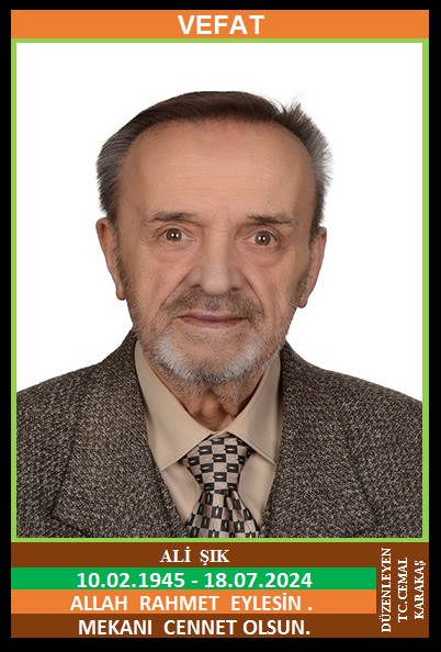 İLÇEMİZ YORTAN BELDESİ MERKEZ MAHALLESİ NÜFUSUNA KAYITLI OLUP, YORTAN MERKEZ MAHALLESİ AKINCILAR CADDESİ NO:11/1’DE İKAMET EDEN MERHUM ALİ ve MERHUME HATİCE OĞLU, MÜZEYYEN ŞIK EŞİ, ÖNCEKİ DÖNEMLER YORTAN BELDESİ BELEDİYE BAŞKANI ALİ ŞIK (10.02.1945 DOĞUMLU) HAKKIN RAHMETİNE KAVUŞMUŞTUR. CENAZESİ (19.07.2024 CUMA GÜNÜ) YORTAN MERKEZ CAMİİNDE CUMA NAMAZINA MÜTEAKİP KILINACAK CENAZE NAMAZINDAN SONRA SON YOLCULUĞUNA UĞURLANACAKTIR. EŞİ MÜZEYYEN ŞIK, ÇOCUKLARI VEYSEL ŞIK, MELİKE KATIRCILAR, GELİNİ TUĞBA ŞIK, DAMADI HARUN KATIRCILAR. ALLAH RAHMET EYLESİN. MEKANI CENNET OLSUN. GERİDE BIRAKTIĞI SEVENLERİNE VE AİLESİNE BAŞSAĞLIĞI VE SABIR DİLERİZ.