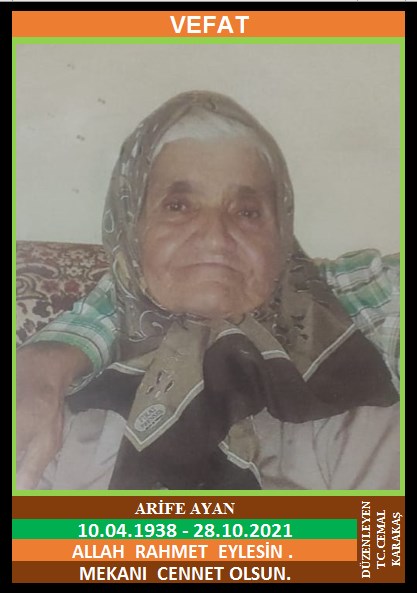 YENİCE YAZIKÖY ÇOBANLAR MAHALLESİ NÜFUSUNA KAYITLI OLUP, YAZIKÖY ÇOBANLAR KÜME EVLERİ NO:8’DE İKAMET EDEN MERHUM HASAN ve MERHUME FATİME KIZI, KADİR AYAN EŞİ, ARİFE AYAN (10.04.1938 DOĞUMLU) HAKKIN RAHMETİNE KAVUŞMUŞTUR. CENAZESİ (29.10.2021 CUMA GÜNÜ) YENİCE MERKEZ CAMİİNDE CUMA NAMAZINA MÜTEAKİP KILINACAK CENAZE NAMAZINDAN SONRA SON YOLCULUĞUNA UĞURLANACAKTIR. EŞİ KADİR AYAN, ÇOCUKLARI RECEP AYAN, BAHRİYE KARAKAŞ, SANİYE DEDE, DAMATLARI RECEP KARAKAŞ, CEVAT DEDE. ALLAH RAHMET EYLESİN. MEKANI CENNET OLSUN. GERİDE BIRAKTIĞI SEVENLERİNE VE AİLESİNE BAŞSAĞLIĞI VE SABIR DİLERİZ.