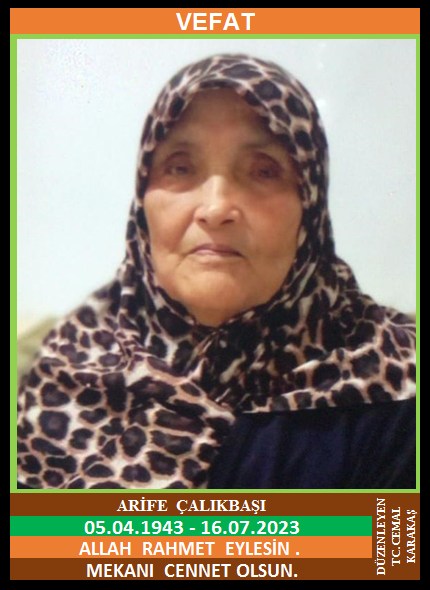 İLÇEMİZ BAĞBAŞI KÖYÜ NÜFUSUNA KAYITLI OLUP, ÖZAL MAHALLESİ KANAL SOKAK NO: 1/1-5’DE İKAMET EDEN MERHUM HASAN ve MERHUME PENPE KIZI, MERHUM RAMAZAN ÇALIKBAŞI EŞİ, ARİFE ÇALIKBAŞI (05.04.1943 DOĞUMLU) HAKKIN RAHMETİNE KAVUŞMUŞTUR. CENAZESİ (16.07.2023 PAZAR GÜNÜ) ÖZAL MAHALLESİ MERKEZ CAMİİNDE İKİNDİ NAMAZINA MÜTEAKİP KILINACAK CENAZE NAMAZINDAN SONRA SON YOLCULUĞUNA UĞURLANACAKTIR. EŞİ MERHUM RAMAZAN ÇALIKBAŞI, ÇOCUKLARI MUSA ÇALIKBAŞI, ABDULLAH ÇALIKBAŞI, HASAN ÇALIKBAŞI, MÜMÜYE ÇALIKBAŞ, EMİNE KOYMALI, ÜLVİYE ÖREN, DAMATLARI ŞABAN ÇALIKBAŞI, SATILMIŞ KOYMALI, BÜLENT ÖREN. ALLAH RAHMET EYLESİN. MEKANI CENNET OLSUN. GERİDE BIRAKTIĞI SEVENLERİNE VE AİLESİNE BAŞSAĞLIĞI VE SABIR DİLERİZ.