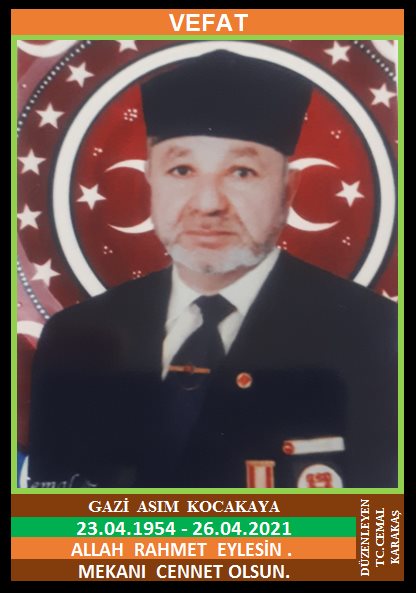 YENİCE YORTAN MERKEZ MAHALLESİ NÜFUSUNA KAYITLI OLUP, YORTAN MERKEZ MAHALLESİ OVA KÜME EVLERİ NO: 55 ve TEKİRDAĞ İLİNDE İKAMET EDEN MERHUM HÜSEYİN ve MERHUME KEZBAN OĞLU, HANİFE KOCAKAYA EŞİ, KIBRIS GAZİSİ ASIM KOCAKAYA (23.04.1954 DOĞUMLU) HAKKIN RAHMETİNE KAVUŞMUŞTUR. CENAZESİ (27.04.2021 SALI GÜNÜ) YORTAN MERKEZ CAMİİNDE ÖĞLE NAMAZI SONRASI KILINACAK CENAZE NAMAZINDAN SONRA SON YOLCULUĞUNA UĞURLANACAKTIR. EŞİ HANİFE KOCAKAYA, ÇOCUKLARI MUHAMMET KOCAKAYA, RAMAZAN KOCAKAYA. ALLAH RAHMET EYLESİN. MEKANI CENNET OLSUN. GERİDE BIRAKTIĞI SEVENLERİNE VE AİLESİNE BAŞSAĞLIĞI VE SABIR DİLERİZ.