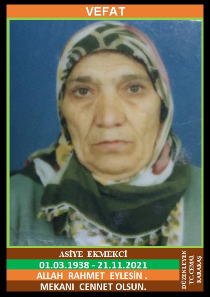 YENİCE SATUK KÖYÜ NÜFUSUNA KAYITLI OLUP, SATUK KÖYÜ UZUMKUM MEVKİ NO:47/A’DA İKAMET EDEN MERHUM MEHMET ve MERHUME KEZBAN KIZI, MERHUM MEHMET EKMEKCİ EŞİ, ASİYE EKMEKCİ (01.03.1938 DOĞUMLU) HAKKIN RAHMETİNE KAVUŞMUŞTUR. CENAZESİ (22.11.2021 PAZARTESİ GÜNÜ) SATUK KÖYÜ UZUMKUM CAMİİNDE ÖĞLE NAMAZINA MÜTEAKİP KILINACAK CENAZE NAMAZINDAN SONRA SON YOLCULUĞUNA UĞURLANACAKTIR. EŞİ MERHUM MEHMET EKMEKCİ, ÇOCUKLARI SATILMIŞ EKMEKCİ, MUZAFFER EKMEKCİ, GÜLSÜM DERELİ, HATİCE EKMEKCİ, KADRİYE SARIBAŞ, ŞENGÜL DERELİ, AYNUR DERELİ, DAMATLARI KADİR EKMEKCİ, MEHMET DERELİ, CELAL SARIBAŞ, ASLAN DERELİ, İHSAN DERELİ. ALLAH RAHMET EYLESİN. MEKANI CENNET OLSUN. GERİDE BIRAKTIĞI SEVENLERİNE VE AİLESİNE BAŞSAĞLIĞI VE SABIR DİLERİZ.
