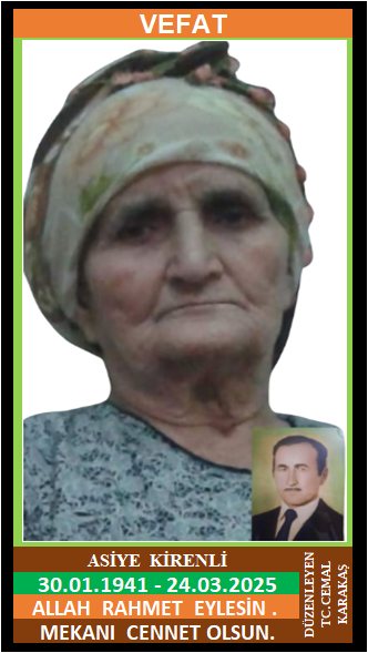 İLÇEMİZ ATATÜRK MAHALLESİ NÜFUSUNA KAYITLI OLUP, ATATÜRK MAHALLESİ ZÜBEYDE HANIM BULVARI NO:98/2’DE İKAMET EDEN MERHUM EMİN ve MERHUME ZEYNEP KIZI, YORÜS EMEKLİSİ MERMUM MEHMET KİRENLİ EŞİ, ASİYE KİRENLİ (30.01.1941 DOĞUMLU) HAKKIN RAHMETİNE KAVUŞMUŞTUR. CENAZESİ (25.03.2025 SALI GÜNÜ) ATATÜRK MAHALLESİ MERKEZ CAMİİNDE ÖĞLE NAMAZINA MÜTEAKİP KILINACAK CENAZE NAMAZINDAN SONRA SON YOLCULUĞUNA UĞURLANACAKTIR. EŞİ MERHUM MEHMET KİRENLİ, ÇOCUKLARI SATILMIŞ KİRENLİ, SELAHATTİN KİRENLİ, NEVZAT KİRENLİ, AYNUR YİRMİBEŞCİK, DAMADI ARSLAN YİRMİBEŞCİK, TORUNLARI ALPER KİRENLİ, ASLI KİRENLİ KAYALI, KARDEŞLERİ MUSTAFA KÖKÇÜ, İSMAİL KÖKÇÜ, MERHUME DÖNDÜ BALAT, MERHUME HANİFE KAYIŞ. ALLAH RAHMET EYLESİN. MEKANI CENNET OLSUN. GERİDE BIRAKTIĞI SEVENLERİNE VE AİLESİNE BAŞSAĞLIĞI VE SABIR DİLERİZ.