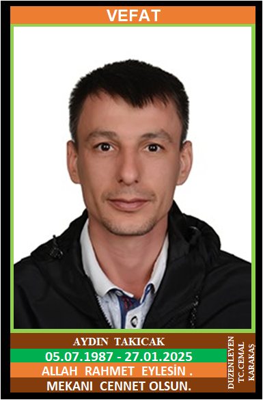 İLÇEMİZ KARŞIYAKA MAHALLESİ NÜFUSUNA KAYITLI OLUP, KARŞIYKA MAHALLESİ ÇAMLIK KÜME EVLERİ NO: 66/1’DE İKAMET EDEN YENİCE ESKİ ESNAFLARINDAN MERHUM SATILMIŞ TAKICAK ve FATİME TAKICAK OĞLU, IŞIN TAKICAK EŞİ, KARABÜK ADLİYESİ ÇALIŞANLARINDAN AYDIN TAKICAK (05.07.1987 DOĞUMLU) ELİM BİR TRAFİK KAZASI SONRASI HAYATA TUTUNAMAYARAK HAKKIN RAHMETİNE KAVUŞMUŞTUR. CENAZESİ (28.01.2025 SALI GÜNÜ) MERKEZ CAMİİNDE İKİNDİ NAMAZINA MÜTEAKİP KILINACAK CENAZE NAMAZINDAN SONRA SON YOLCULUĞUNA UĞURLANACAKTIR. ANNESİ FATİME TAKICAK, KAYINBABASI SEDAT ÖREN, KAYINVALİDESİ AYNUR ÖREN, EŞİ IŞIN TAKICAK, ÇOCUKLARI TÜMER TAKICAK, BİLGESU TAKICAK, KARDEŞLERİ ADEM TAKICAK, AYTEN SERİN, AYNUR TAKICAK, NECLA CİNKAVUK, AYGÜL BAY. ALLAH RAHMET EYLESİN. MEKANI CENNET OLSUN. GERİDE BIRAKTIĞI SEVENLERİNE VE AİLESİNE BAŞSAĞLIĞI VE SABIR DİLERİZ.