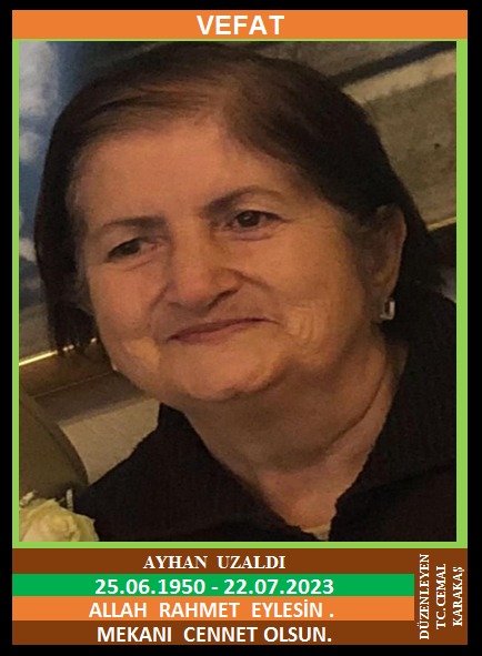 İLÇEMİZ ATATÜRK MAHALLESİ HACI MUHARREMLER SEMTİ NÜFUSUNA KAYITLI OLUP, ALMANYA’DA İKAMET EDEN MERHUM TEVFİK DEREBAŞI ve MERHUME ASİYE DEREBAŞI KIZI, AYHAN UZALDI (25.06.1950 DOĞUMLU) HAKKIN RAHMETİNE KAVUŞMUŞTUR. CENAZESİ (25.07.2023 SALl GÜNÜ) ÇAYCUMA İLÇESİ MERKEZ CAMİİNDE ÖĞLE NAMAZINA MÜTEAKİP KILINACAK CENAZE NAMAZINDAN SONRA SON YOLCULUĞUNA UĞURLANACAKTIR. ÇOCUKLARI YETKİN UZALDI, YEŞİM YAVUZ, YELİZ KURT, KARDEŞLERİ BURHAN DEREBAŞI, MERHUM İRFAN DEREBAŞI, NEZAKET DEREBAŞI, İHSANE DEREBAŞI, YEĞENLERİ DİNÇ DEREBAŞI, ERHAN DEREBAŞI, OZAN DEREBAŞI, OKAN DEREBAŞI, SUAT ERGÜDER, NEDİM ERGÜDER. ALLAH RAHMET EYLESİN. MEKANI CENNET OLSUN. GERİDE BIRAKTIĞI SEVENLERİNE VE AİLESİNE BAŞSAĞLIĞI VE SABIR DİLERİZ.