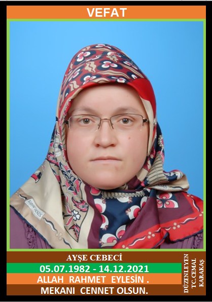 YENİCE ÇAMLIKÖY NÜFUSUNA KAYITLI OLUP, ÇAMLIKÖY AŞAĞI KÜME EVLERİ NO:11’DE İKAMET EDEN OSMAN ve FATMA KIZI, SAMİ CEBECİ EŞİ, AYŞE CEBECİ (05.07.1982 DOĞUMLU) HAKKIN RAHMETİNE KAVUŞMUŞTUR. CENAZESİ (15.12.2021 ÇARŞAMBA GÜNÜ) ÇAMLIKÖY MERKEZ CAMİİNDE ÖĞLE NAMAZINA MÜTEAKİP KILINACAK CENAZE NAMAZINDAN SONRA SON YOLCULUĞUNA UĞURLANACAKTIR. EŞİ SAMİ CEBECİ, ÇOCUKLARI ÖZCAN CEBECİ, ÇİĞDEM CEBECİ. ALLAH RAHMET EYLESİN. MEKANI CENNET OLSUN. GERİDE BIRAKTIĞI SEVENLERİNE VE AİLESİNE BAŞSAĞLIĞI VE SABIR DİLERİZ.