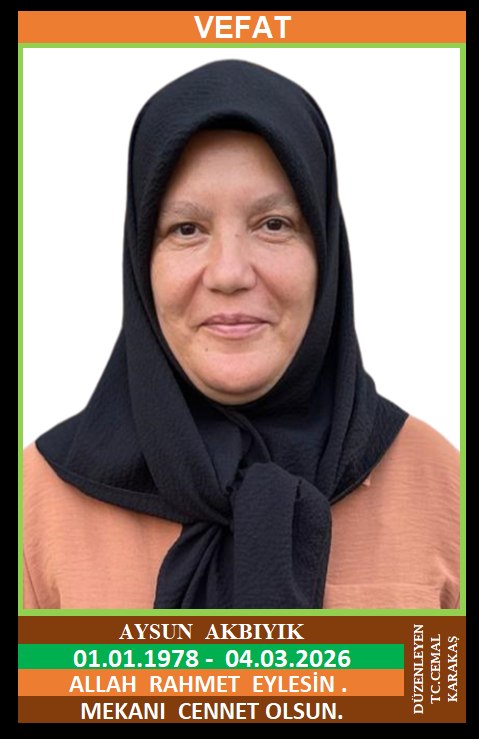 İLÇEMİZ GÜNEY KÖYÜ AKBIYIKLAR MAHALLESİ NÜFUSUNA KAYITLI OLUP, ZONGULDAK İLİNDE İKAMET EDEN MERHUM ASLAN KARA ve FİDAN KARA KIZI, FİKRET AKBIYIK EŞİ, AYSUN AKBIYIK (01.01.1978 DOĞUMLU) HAKKIN RAHMETİNE KAVUŞMUŞTUR. CENAZESİ (05.03.2026 PERŞEMBE GÜNÜ) YENİCE MERKEZ CAMİİNDE ÖĞLE NAMAZINA MÜTEAKİP KILINACAK CENAZE NAMAZINDAN SONRA SON YOLCULUĞUNA UĞURLANACAKTIR. ANNESİ FİDAN KARA, EŞİ FİKRET AKBIYIK, ÇOCUKLARI MUHAMMET AKBIYIK, ABDULLAH AKBIYIK, BERNA AKBIYIK, KARDEŞLERİ MEHMET KARA, SERPİL AKBIYIK, SEMRA SEZER, AYLA KARA. ALLAH RAHMET EYLESİN. MEKANI CENNET OLSUN. GERİDE BIRAKTIĞI SEVENLERİNE VE AİLESİNE BAŞSAĞLIĞI VE SABIR DİLERİZ.