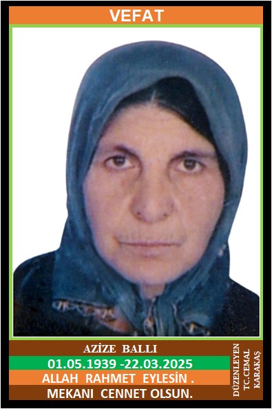 İLÇEMİZ ESENKÖY KÖYÜ NÜFUSUNA KAYITLI OLUP, ESENKÖY KÖYÜ TORHUN KÜME EVLERİ NO:23’DE İKAMET EDEN MERHUM MEHMET ALİ ve MERHUME RABİA KIZI, MERHUM İSMAİL BALLI EŞİ, ESENKÖY MUHTARI SATILMIŞ BALLI’NIN ANNESİ, AZİZE BALLI (01.05.1939 DOĞUMLU) HAKKIN RAHMETİNE KAVUŞMUŞTUR. CENAZESİ (23.03.2025 PAZAR GÜNÜ) ESENKÖY KÖYÜ TORHUN MAHALLESİ CAMİİNDE ÖĞLE NAMAZINA MÜTEAKİP KILINACAK CENAZE NAMAZINDAN SONRA SON YOLCULUĞUNA UĞURLANACAKTIR. EŞİ MERHUM İSMAİL BALLI, ÇOCUKLARI SATILMIŞ BALLI, KEMAL BALLI, MUZAFFER BALLI, SIDIKA BALLI, SAKİNE YİRMİBEŞ, DAMATLARI ATALAY BALLI, FERDİ YİRMİBEŞ. ALLAH RAHMET EYLESİN. MEKANI CENNET OLSUN. GERİDE BIRAKTIĞI SEVENLERİNE VE AİLESİNE BAŞSAĞLIĞI VE SABIR DİLERİZ.
