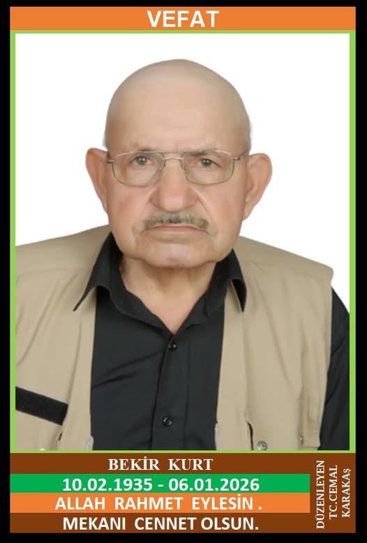 İLÇEMİZ GÜNEY KÖYÜ KURTLAR MAHALLESİ NÜFUSUNA KAYITLI OLUP, GÜNEY KÖYÜ KURTLAR KÜME EVLERİ NO:2 ‘DE İKAMET EDEN MERHUM İSMAİL ve MERHUME NAZİFE OĞLU, MERHUME SAKİNE KURT EŞİ, MADEN EMEKLİSİ BEKİR KURT (10.02.1935 DOĞUMLU) HAKKIN RAHMETİNE KAVUŞMUŞTUR. CENAZESİ (07.01.2026 ÇARŞAMBA GÜNÜ) İSMETPAŞA MAHALLESİ MERKEZ CAMİİNDE ÖĞLE NAMAZINA MÜTEAKİP KILINACAK CENAZE NAMAZINDAN SONRA SON YOLCULUĞUNA UĞURLANACAKTIR. EŞİ MERHUME SAKİNE KURT, ÇOCUKLARI SATI KURT, SEVİL EREN, DAMATLARI ORHAN KURT, MUSTAFA EREN, KARDEŞLERİ MERHUM HASAN KURT, MERHUM VELİ KURT, ALLAH RAHMET EYLESİN. MEKANI CENNET OLSUN. GERİDE BIRAKTIĞI SEVENLERİNE VE AİLESİNE BAŞSAĞLIĞI VE SABIR DİLERİZ.