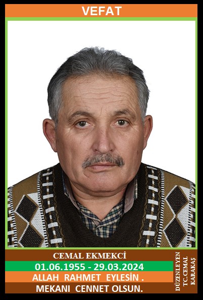 İLÇEMİZ SARAYKÖY NÜFUSUNA KAYITLI OLUP, SARAYKÖY SARAYDÜZÜ KÜME EVLERİ NO:23/2’DE İKAMET EDEN MERHUM MEHMET ve MERHUME ASİYE OĞLU, HANİFE EKMEKCİ EŞİ, TTK EMEKLİSİ CEMAL EKMEKCİ (01.06.1955 DOĞUMLU) HAKKIN RAHMETİNE KAVUŞMUŞTUR. CENAZESİ (29.03.2024 CUMA GÜNÜ) SARAYKÖY MERKEZ MAHALLE CAMİİNDE İKİNDİ NAMAZINA MÜTEAKİP KILINACAK CENAZE NAMAZINDAN SONRA SON YOLCULUĞUNA UĞURLANACAKTIR. EŞİ HANİFE EKMEKCİ, ÇOCUKLARI CENGİZ EKMEKCİ, METİN EKMEKCİ, MURAT EKMEKCİ, SEMRA EKMEKCİ, SEVGİ TAVUKCU, DAMADI MURAT TAVUKCU, KARDEŞLERİ MEHMET EKMEKCİ, MUSTAFA EKMEKCİ. ALLAH RAHMET EYLESİN. MEKANI CENNET OLSUN. GERİDE BIRAKTIĞI SEVENLERİNE VE AİLESİNE BAŞSAĞLIĞI VE SABIR DİLERİZ.