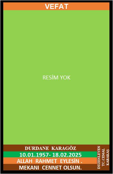 İLÇEMİZ YORTAN BELDESİ MERKEZ MAHALLE NÜFUSUNA KAYITLI OLUP,  YORTAN BELDESİ MERKEZ MAHALLE BİRLİK KÜME EVLERİ NO:17’DE İKAMET EDEN MERHUM MEHMET ve MERHUME AYŞE KIZI, YORTAN MÜNİBÜSCÜLERİDEN ADİL KARAGÖZ’ÜN HALASI DURDANE KARAGÖZ (10.01.1957 DOĞUMLU) HAKKIN RAHMETİNE KAVUŞMUŞTUR. CENAZESİ (18.02.2025 SALI GÜNÜ) YORTAN BELDESİ MERKEZ CAMİİNDE ÖĞLE NAMAZINA MÜTEAKİP KILINACAK CENAZE NAMAZINDAN SONRA SON YOLCULUĞUNA UĞURLANACAKTIR. KARDEŞLERİ MEHMET KARAGÖZ, YAŞAR KARAGÖZ, MERHUM SATILMIŞ KARAGÖZ, MERHUM RAMAZAN KARAGÖZ, YEĞENİ ADİL KARAGÖZ. ALLAH RAHMET EYLESİN. MEKANI CENNET OLSUN. GERİDE BIRAKTIĞI SEVENLERİNE VE AİLESİNE BAŞSAĞLIĞI VE SABIR DİLERİZ.