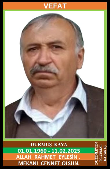 İLÇEMİZ DEĞİRMENYANI KÖYÜ KADIOĞLU MAHALLESİ NÜFUSUNA KAYITLI OLUP, DEĞİRMENYANI KÖYÜ KADIOĞLU KÜME EVLERİ NO: 37’DE İKAMET EDEN RECEP ve FATİME OĞLU, ŞERİFE KAYA EŞİ, MADEN EMEKLİSİ DURMUŞ KAYA (01.01.1960 DOĞUMLU ) HAKKIN RAHMETİNE KAVUŞMUŞTUR. CENAZESİ BUGÜN (12.02.2025 ÇARŞAMBA GÜNÜ) YENİCE DEĞİRMENYANI KÖYÜ MERKEZ MAHALLESİ CAMİİNDE ÖĞLE NAMAZINA MÜTEAKİP KILINACAK CENAZE NAMAZINDAN SONRA SON YOLCULUĞUNA UĞURLANACAKTIR. EŞİ ŞERİFE KAYA, ÇOCUKLARI MUHAMMET KAYA, ABDULLAH KAYA, DÖNDÜ KAYA, HAMİDİYE KARAÖREN, MURADİYE KAZANCI, DAMATLARI YORTAN BELDESİ ÇENGELLER MUHTARI İSA KARAÖREN, SELAMİ KAZANCI, KARDEŞİ CEMAL KAYA. ALLAH RAHMET EYLESİN. MEKANI CENNET OLSUN. GERİDE BIRAKTIĞI SEVENLERİNE VE AİLESİNE BAŞSAĞLIĞI VE SABIR DİLERİZ.