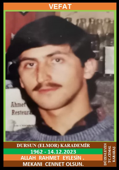 KARABÜK İLİ ESKİPAZAR İLÇESİ YALAKKUZ KÖYÜ NUFÜSUNA KAYITLI OLUP, ANTALYA’DA İKAMET EDEN MERHUM UZUN YILLAR İLÇEMİZDE ESNAFLIK (LOKANTACILIK)  YAPAN VE AHMET USTA OLARAK BİLİNEN, AHMET KARADEMİR ve MERHUME ŞERİFE KARADEMİR’İN OĞLU ELMOR LAKABI İLE BİLİNE  (1962 DOĞUMLU) HAKKIN RAHMETİNE KAVUŞMUŞTUR. CENAZESİ ( ….12.2023… GÜNÜ ) ESKİPAZAR İLÇESİ YALAKKUZ KÖYÜ CAMİİNDE KILINACAK CENAZE NAMAZINDAN SONRA SON YOLCULUĞUNA UĞURLANACAKTIR. BABASI MERHUM AHMET KARADEMİR, ANNESİ MERHUME ŞERİFE KARADEMİR, KARDEŞLERİ ALİ KARADEMİR, NERİMAN ÇANAKCI, YILDIZ SALMAN. ALLAH RAHMET EYLESİN. MEKANI CENNET OLSUN. GERİDE BIRAKTIĞI SEVENLERİNE VE AİLESİNE BAŞSAĞLIĞI VE SABIR DİLERİZ.