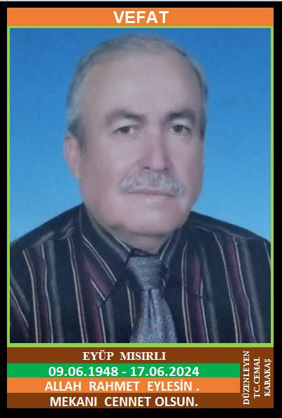 İLÇEMİZ GÜNEY KÖYÜ ARSLANLAR MAHALLESİ NÜFUSUNA KAYITLI OLUP, ZONGULDAK KOZLU’DA İKAMET EDEN MERHUM MEHMET ve MERHUME DÖNDÜ OĞLU, ELMAS MISIRLI EŞİ, MADEN EMEKLİSİ ÖRDEK LAKABI İLE BİLİNEN EYÜP MISIRLI (09.06.1948 DOĞUMLU) HAKKIN RAHMETİNE KAVUŞMUŞTUR. CENAZESİ (19.06.2024 ÇARŞAMBA GÜNÜ) KOZLU MERKEZ CAMİİNDE ÖĞLE NAMAZI SONRASI ve YENİCE GÜNEY KÖYÜ ARSLANLAR MAHALLESİ CAMİİNDE SAAT 15.00’DA KILINACAK CENAZE NAMAZINDAN SONRA SON YOLCULUĞUNA UĞURLANACAKTIR. EŞİ ELMAS MISIRLI ÇOCUKLARI ERCAN MISIRLI, ERKAN MISIRLI, ERSAN MISIRLI, KARDEŞLERİ ŞEVKİ MISIRLI, ZİYA MISIRLI, ŞENOL MISIRLI, ŞAZİYE ARAT, MERHUME FATMA ARSLAN, MERHUME SIDIKA KALAYCI. ALLAH RAHMET EYLESİN. MEKANI CENNET OLSUN. GERİDE BIRAKTIĞI SEVENLERİNE VE AİLESİNE BAŞSAĞLIĞI VE SABIR DİLERİZ.