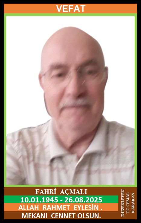 İLÇEMİZ KAYAARKASI KÖYÜ NÜFUSUNA KAYITLI OLUP, MENDERES MAHALLESİ ÖRENPARK EVLERİNDE İKAMET EDEN MERHUM SELİM ve MERHUME HANİFE OĞLU, MÜRRÜVET AÇMALI EŞİ, ÇAYCUMA SEKA EMEKLİSİ FAHRİ AÇMALI (10.01.1945 DOĞUMLU) HAKKIN RAHMETİNE KAVUŞMUŞTUR. CENAZESİ (26.08.2025 SALI GÜNÜ) YENİCE MERKEZ CAMİİNDE İKİNDİ NAMAZINA MÜTEAKİP KILINACAK CENAZE NAMAZINDAN SONRA SON YOLCULUĞUNA UĞURLANACAKTIR. EŞİ MÜRRÜVET AÇMALI, ÇOCUKLARI ÖZGÜR AÇMALI, SELİM AÇMALI, YENİCE SAĞLIK OCAĞI HEMŞİRESİ İLKAY ÖRENCİK, DAMADI DOKTOR ERTAN ÖRENCİK, KARDEŞLERİ BAHRİ AÇMALI, EFRAYİM AÇMALI, MERHUME KEZBAN KARADAYI, MERHUME MÜRVET KARADAYI, TORUNU YENİCE SAĞLIK OCAĞI DOKTORU CEM YİĞİT ÖRENCİK. ALLAH RAHMET EYLESİN. MEKANI CENNET OLSUN. GERİDE BIRAKTIĞI SEVENLERİNE VE AİLESİNE BAŞSAĞLIĞI VE SABIR DİLERİZ.