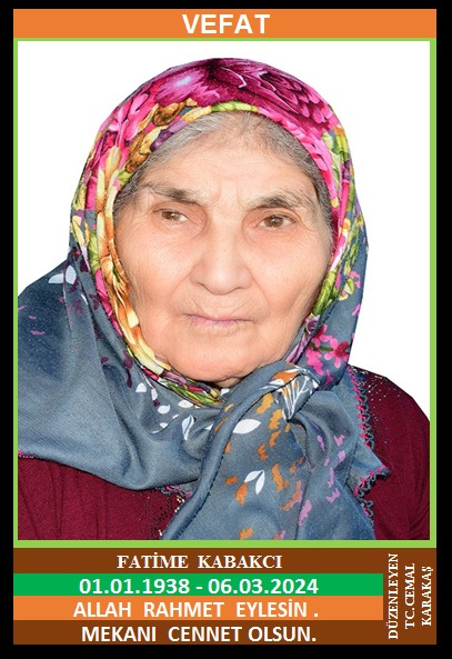 İLÇEMİZ DEĞİRMENYANI KÖYÜ KADIOĞLU MAHALLESİ NÜFUSUNA KAYITLI OLUP, ŞİRİNKÖY KÖYÜ MERKEZ KÜME EVLERİ NO:103’DE İKAMET EDEN MERHUM NURİ ve MERHUME KEZBAN KIZI, ALMANYA EMEKLİSİ DURMUŞ KABAKCI EŞİ, FATİME KABAKCI (01.01.1938 DOĞUMLU) HAKKIN RAHMETİNE KAVUŞMUŞTUR. CENAZESİ (07.03.2024 PERŞEMBE GÜNÜ) ŞİRİNKÖY KÖYÜ MERKEZ CAMİİNDE .. NAMAZINA MÜTEAKİP KILINACAK CENAZE NAMAZINDAN SONRA SON YOLCULUĞUNA UĞURLANACAKTIR. EŞİ ALMANYA EMEKLİSİ DURMUŞ KABAKCI, ÇOCUKLARI DURSUN KABAKCI, SİNAN KABAKCI, NECATİ KABAKCI, MEHMET KABAKCI, ZAİM KABAKCI, MERHUM İHSAN KABAKCI, HALİSE KAYA, HAYRİYE ÖREN, MUHAMMET KAYA, ÖZKAN ÖREN. ALLAH RAHMET EYLESİN. MEKANI CENNET OLSUN. GERİDE BIRAKTIĞI SEVENLERİNE VE AİLESİNE BAŞSAĞLIĞI VE SABIR DİLERİZ.