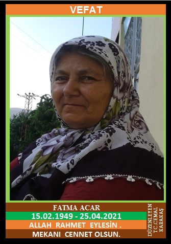 YENİCE YORTAN ATATÜRK MAHALLESİ NÜFUSUNA KAYITLI OLUP, YORTAN ATATÜRK 6. SOKAK NO:7/1 ‘DE İKAMET EDEN MERHUM HÜSEYİN ve MERHUME DÖNDÜ KIZI, YORTAN ATATÜRK MAHALLESİ ESKİ MUHTARI YAŞAR ACAR’IN EŞİ, YENİCE DEREBAŞI İMAMKÖY CAMİ HOCASI İSA CİVELEK’İN KAYINVALDESİ, FATMA ACAR (15.02.1949 DOĞUMLU) HAKKIN RAHMETİNE KAVUŞMUŞTUR. CENAZESİ  (26.04.2021 PAZARTESİ GÜNÜ) YORTAN ATATÜRK MAHALLESİ BÜYÜKDÜZ CAMİİNDE ÖĞLE NAMAZI SONRASI KILINACAK CENAZE NAMAZINDAN SONRA SON YOLCULUĞUNA UĞURLANACAKTIR. EŞİ YAŞAR ACAR, ÇOCUKLARI ŞİNASİ ACAR, HASAN ACAR, ERGÜN ACAR, NAZİKER CİVELEK, DAMADI YENİCE DEREBAŞI İMAMKÖY CAMİ HOCASI İSA CİVELEK. ALLAH RAHMET EYLESİN. MEKANI CENNET OLSUN. GERİDE BIRAKTIĞI SEVENLERİNE VE AİLESİNE BAŞSAĞLIĞI VE SABIR DİLERİZ.