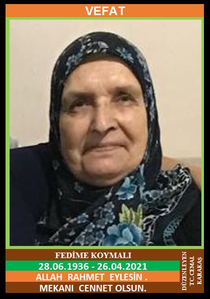 YENİCE ÖRENKÖY KÖYÜ NÜFUSUNA KAYITLI OLUP, ÖREN KÖYÜ MERKEZ MEVKİ NO:95/1’DE İKAMET EDEN MERHUM MUSTAFA ve MERHUME AYŞE KIZI, MERHUM ASIM KOYMALI EŞİ, FEDİME KOYMALI (28.06.1936 DOĞUMLU) HAKKIN RAHMETİNE KAVUŞMUŞTUR. CENAZESİ (26.04.2021 PAZARTESİ GÜNÜ) ÖRENKÖY MERKEZ CAMİDE KILINACAK CENAZE NAMAZINDAN SONRA SON YOLCULUĞUNA UĞURLANACAKTIR. EŞİ MERHUM ASIM KOYMALI, ÇOCUKLARI HURŞİT KOYMALI, TURCAN KOYMALI, MERHUM BİLGİN KOYMALI, HİLMİ KOYMALI, MERHUME MÜZEYYEN BASANÇELEBİ, AYŞE KARAKAŞ, DAMATLARI HAKKI BASANÇELEBİ, AHMET KARAKAŞ. ALLAH RAHMET EYLESİN. MEKANI CENNET OLSUN. GERİDE BIRAKTIĞI SEVENLERİNE VE AİLESİNE BAŞSAĞLIĞI VE SABIR DİLERİZ.